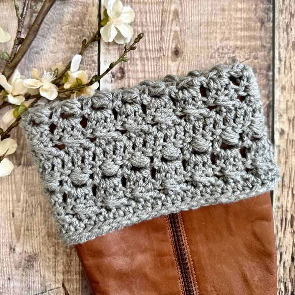 The main feature of these beautiful crochet boot cuffs is its unusual texture. The Puffs & Grannies of the cuff body, an easily worked stitch pattern, provides cozy texture that feels intentional and chic.