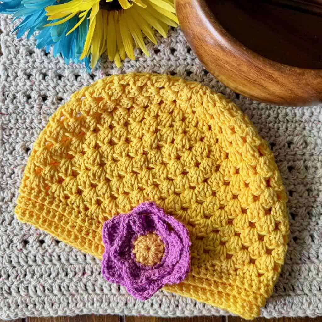 The granny stitch hat is finished off with a decorative band and an optional flower for a bit of pizzazz. Depending on the taste of the recipient, the flower can be any size you like. Or, a decorative button or other ornament can be added to finish off with style.